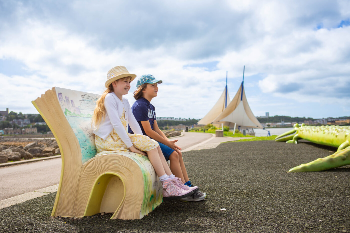 arddangosfa awyr agored Capten Scott a cherflun a mainc lyfrau mympwyol y Crocodeil Enfawr – mae eu cyffyrddiad creadigol yn dod â straeon y Bae yn fyw.